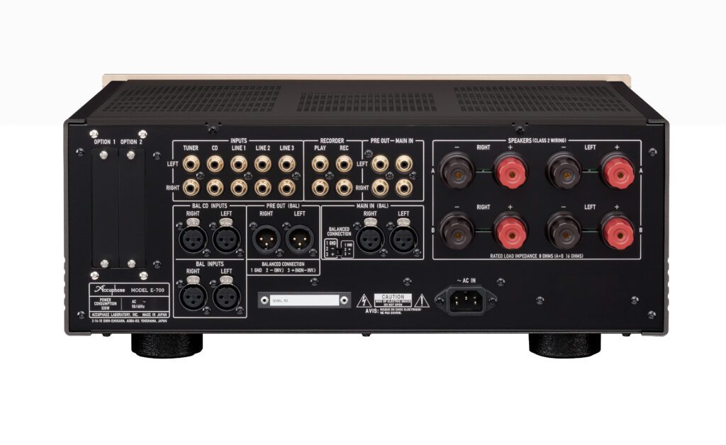 On the rear panel, the E-700 provides five line-level RCA inputs, two sets of balanced XLR inputs, a monitor loop for a recorder or equaliser/signal processor, preamp out and in – balanced and unbalanced – plus two sets of speaker binding posts for either two sets of speakers or one pair bi-amped or bi-wired. There is no built-in DAC or phono input, but these are available as optional plug-in boards.