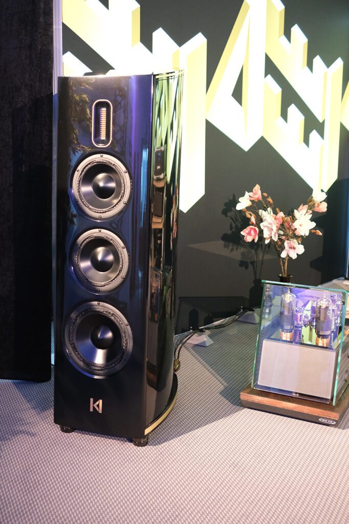 The new €88,000 Callas by Spanish artisan loudspeaker brand Kroma Atelier is the most affordable model in the company’s flagship Reference Series. The four-way bass-reflex design uses Kroma Atelier’s preferred cabinet material, Krion. This rigid mineral in resin material has been chosen for its non-resonant properties. Its drivers include two AMT tweeters, two anodised aluminium 8″ midrange drivers, and two 10″ anodised aluminium bass drivers. Callas features quality crossover components and weighs in at a healthy 123 kg. It sits on Gaia I feet made for the brand by IsoAcoustics. Running from Engstrom valve amplification, the Callas more than delivered the musical goods at the show.