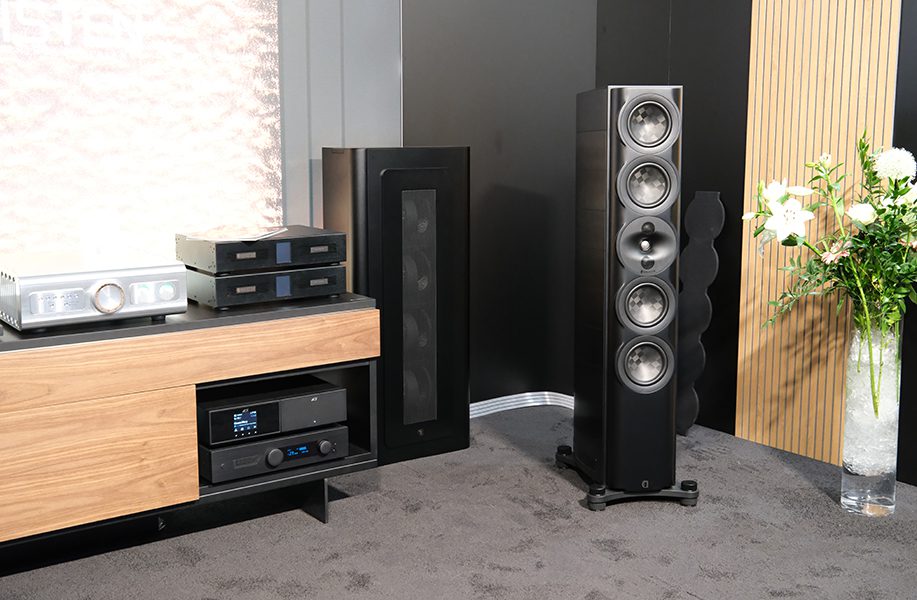 Scottish speaker makers Fyne Audio had many new and upcoming loudspeaker projects on show at Munich High-End 2025. The brand’s latest ‘Special Production’ model is the €24,000 F704SP floorstander. These join the SP versions of the F701, F702 and F703 models. The F704SP sports a 300mm IsoFlare driver (which places a 75mm titanium dome tweeter at the acoustic centre of its 300mm multi-fibre mid/bass cone). This is accompanied by a matching 300mm multi-fibre driver for bass. The SP treatment features significantly upgraded components in the hand-built, cryogenically treated crossover network. Also new and on demonstration was the €2,800 F502S 2x 8″ IsoFlare floorstander. The company flipped between playing these on an all-Rega system and an all-Unison Research system. The speakers sounded equally at home on both.